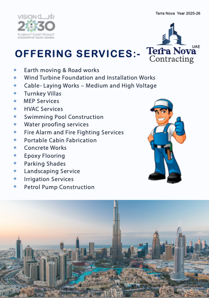 Terra Nova. is a leading provider of high-quality, afford- able construction work Since 15 Years in EPC, Wind Turbines, Solar Solutions, Road Infrastructure, Electrome- chanical & civil work, Epoxy Flooring & Water Proofing , Paint & Gypsum Board , MEP services, Fire Fighting services , AC & Hvac Services, Land survey, Petrol Pump Construction, Project Designing, , Project Management, Building Renovation ,swimming pool work, General Con- tracting , concrete work, air conditioning maintenance and installation services.